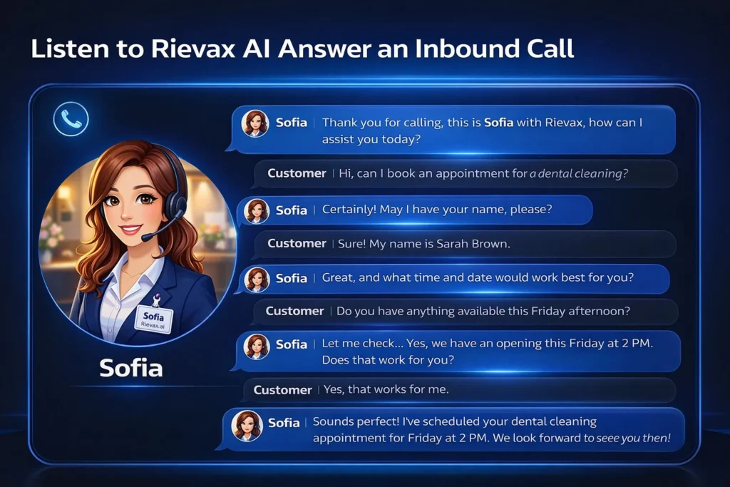 Listen to how Rievax AI sounds when real customers call in. This short demo shows one of our industry-trained AI personas answering an inbound call, responding naturally, and guiding the conversation just like a real front-desk team member.